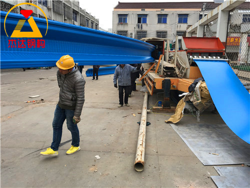 • 安裝階段:拱形屋頂瓦由杰達無梁拱設備現場壓型成型,逐榀吊裝拼接,完成后再依次安裝山墻瓦及過道屋面板。