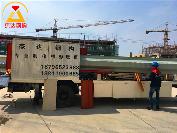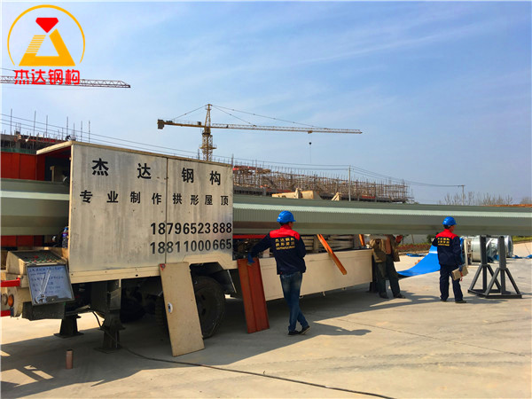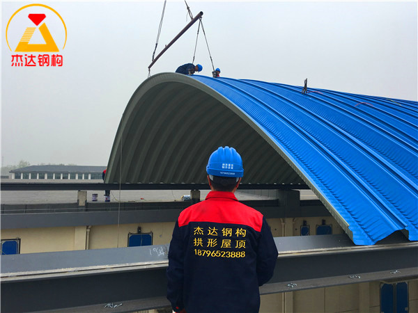 本次工程由杰達(dá)鋼構(gòu)團(tuán)隊(duì)全面負(fù)責(zé),包括拱形屋頂?shù)?strong>壓型制作與安裝作業(yè),三道通長(zhǎng)采光帶的布局,以及兩側(cè)山墻瓦的壓型安裝等關(guān)鍵環(huán)節(jié)。施工過(guò)程規(guī)范,工期緊湊,自2024年4月2日正式開(kāi)工,于4月14日順利竣工。