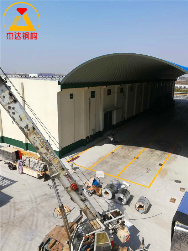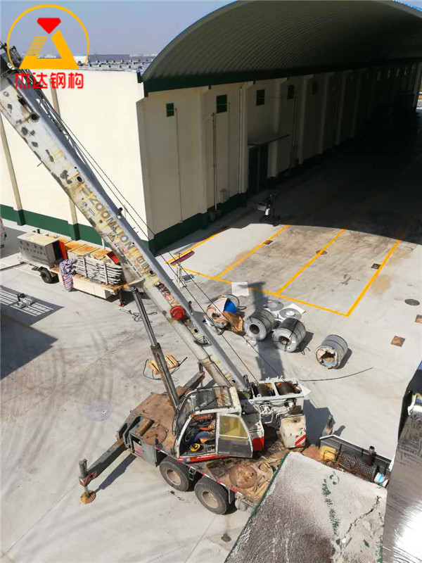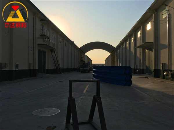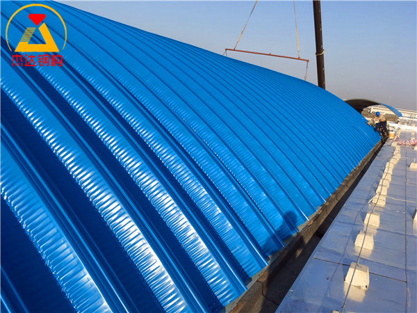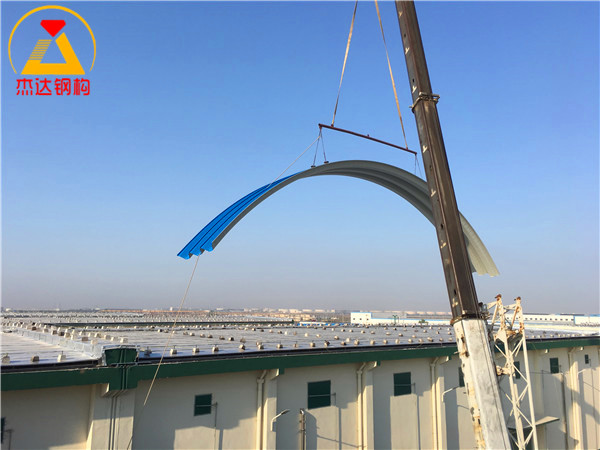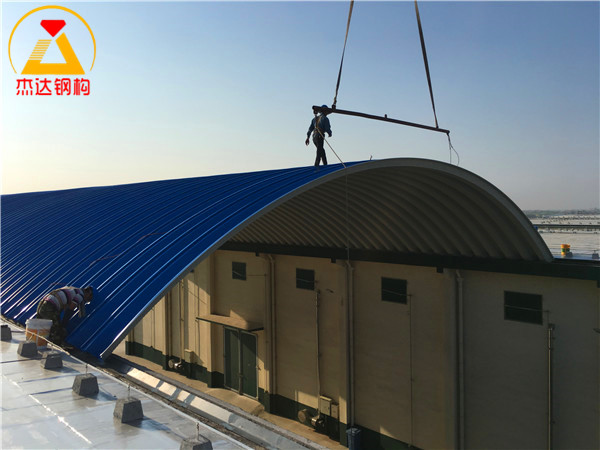 該拱形屋頂跨度17.9米,長(zhǎng)度856米,總建筑面積為1521.5平方米。施工中使用1.0mm厚的高強(qiáng)彩涂卷材,結(jié)合焊接托板,實(shí)現(xiàn)了矢跨比為0.2的穩(wěn)定拱形結(jié)構(gòu)。