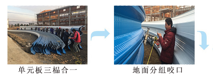 2.土建工程施工到檐口上皮標高時,應按拱形屋頂構造要求準確留出所有埋件,下一工序轉交杰達鋼構施工人員進入工地進行拱形彩板安裝,待做完通風、采光及噴涂室內保溫層后即可退出現場。