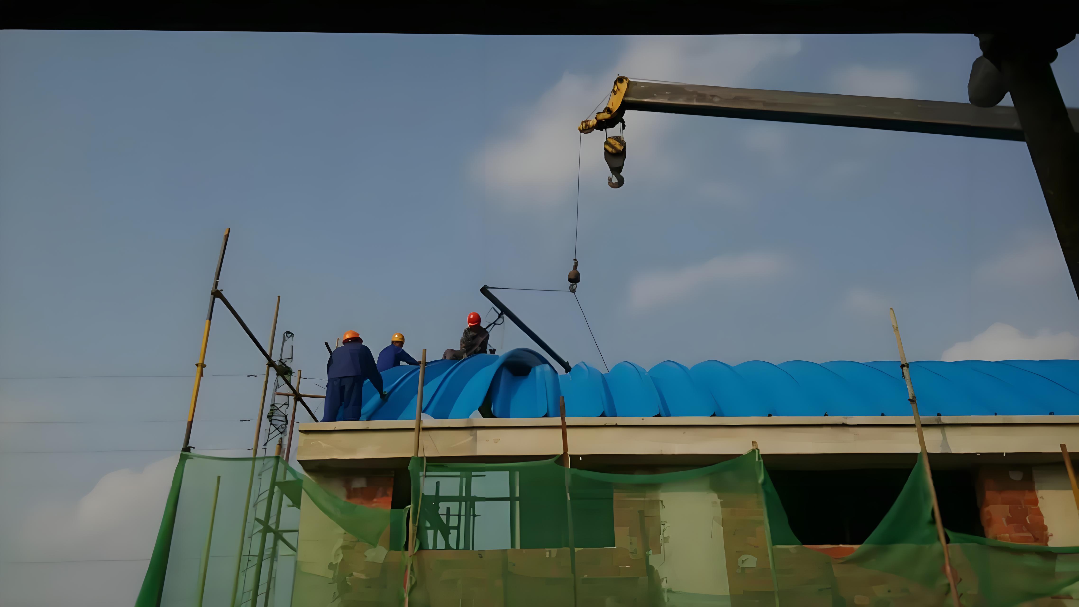 本次金屬波紋拱型屋頂工程中,江蘇杰達鋼結構工程有限公司采用上海寶鋼高強彩鋼板,板材寬度914毫米,厚度0.8毫米,顏色為海藍色。屋頂結構采用914-610無梁拱壓制技術,確保施工質量與結構穩固,施工過程中配合高效的吊裝勞務,保障工程順利完成。