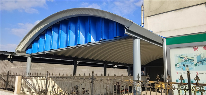 該項目采用的無梁拱形屋頂結構,外觀呈現海藍色,整體設計緊湊,功能齊備。施工中我們在兩側安裝了山墻封閉結構,進一步提升了整體的穩定性和防護性能。