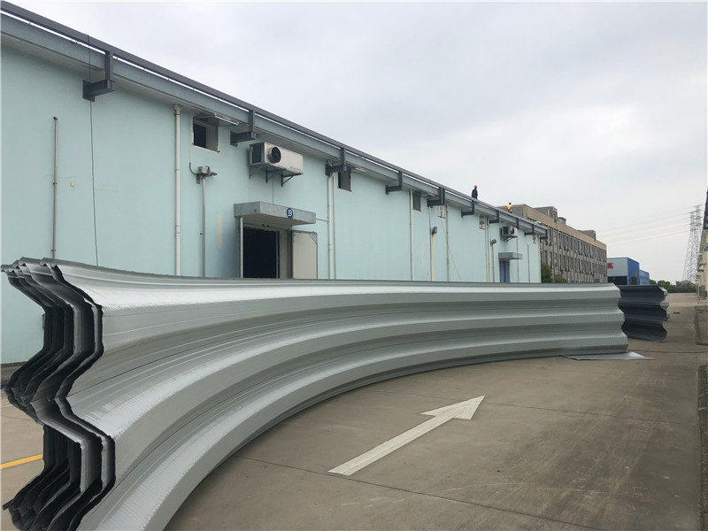 此次罩棚采用拱形結(jié)構(gòu),矢跨比約為0.2,能夠有效分散屋頂?shù)暮奢d壓力,提升整體穩(wěn)定性。拱形屋頂采用鐵青灰色涂層,與糧庫(kù)現(xiàn)有天溝相結(jié)合,保證了屋頂邊緣與糧庫(kù)主體結(jié)構(gòu)的緊密連接,減少了漏水和結(jié)構(gòu)裂縫的風(fēng)險(xiǎn)。